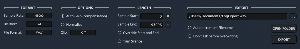 You can easily load any audio file (WAV, AIFF, or FLAC) into Fog Convolver with a simple Drag and Drop, or by using the built-in browser. If you drag two files, they will be assigned to IR1 and IR2.
