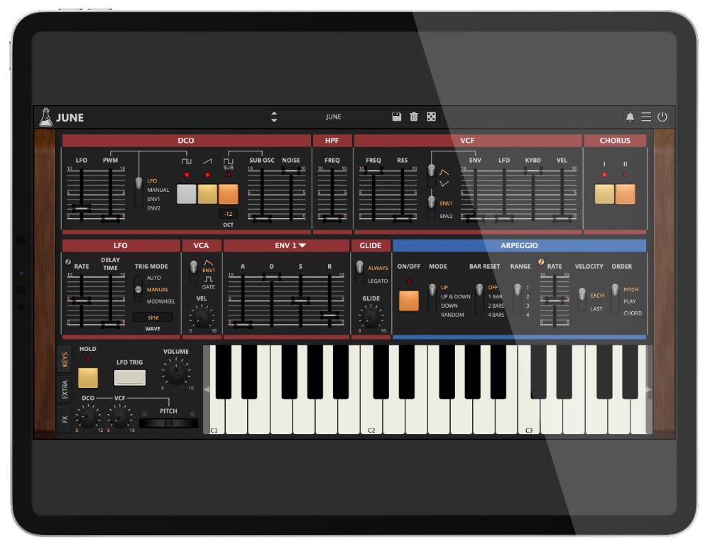 JUNE is a faithful emulation of the Roland JUNO-60, one of the most iconic polyphonic analog synthesizers from the early 1980s.